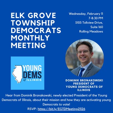 Hear Dominik Bronakowski, newly elected President of the Young Democrats of Illinois. The meeting will be on Wednesday, February 11 at 7pm at 5105 Tollview Drive, Suite 160, Rolling Meadows.